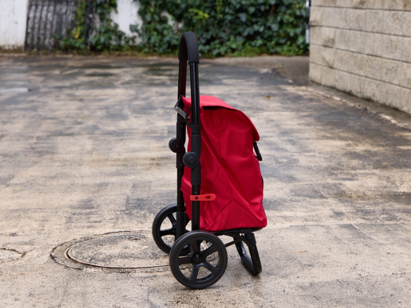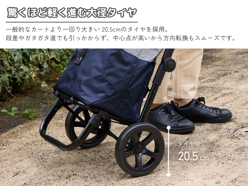 通常のショッピングカートより一回り大きい20.5cmのシングルタイヤを搭載し、タイヤ中心点が高い設計により方向転換が軽やか。混雑した場所でも扱いやすく、デコボコ道でも安定した走行が可能です。軽い力で引けるので、年齢を問わず快適にお使いいただけます。