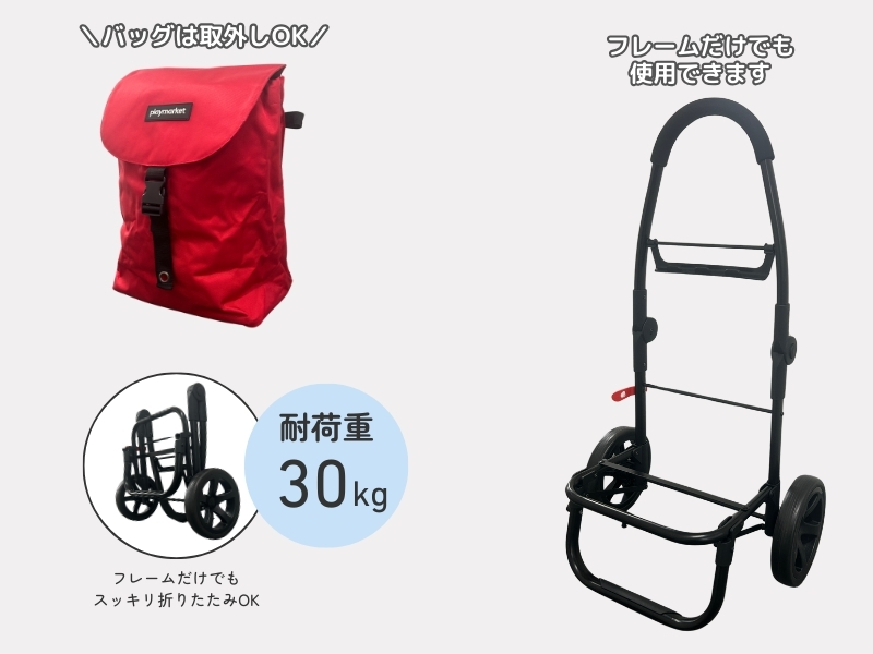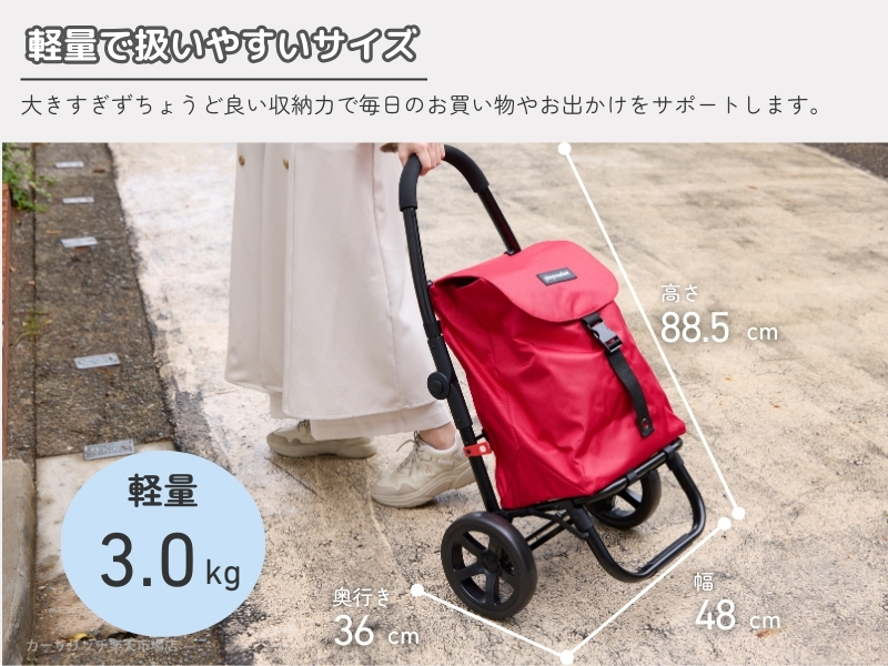 本体はわずか3.0kg。女性や小柄な方でも持ち運びやすく、エレベーターや狭い通路でもスムーズに移動できます(使用時サイズ:W48×D36×H88.5cm)。軽量ながら堅牢なフレームで日常使いの耐久性を確保し、毎日の買い物導線を快適にします。