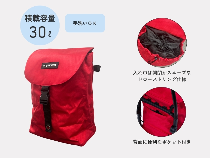 バッグ容量は30リットル。コンパクトながら食材や日用品がしっかり収まるので普段使いに最適です。開口は出し入れしやすいドローストリング(巾着)仕様で中身が見えにくく、背面ポケットなどの収納機能も充実。バッグは手洗いOKで清潔に使える点も日常使いにうれしいポイントです。