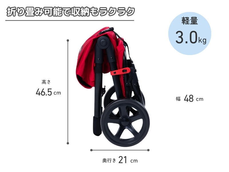 使わないときはコンパクトに折りたたむことができ、収納時サイズはW48×D21×H46.5cm。車のトランクや玄関の狭いスペースにも収まりやすく、2台持ちや家族での共有にも便利です。