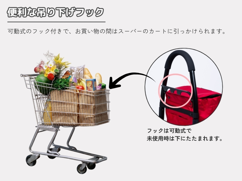 ■便利な可動式フックでスーパーのカートにも簡単連結