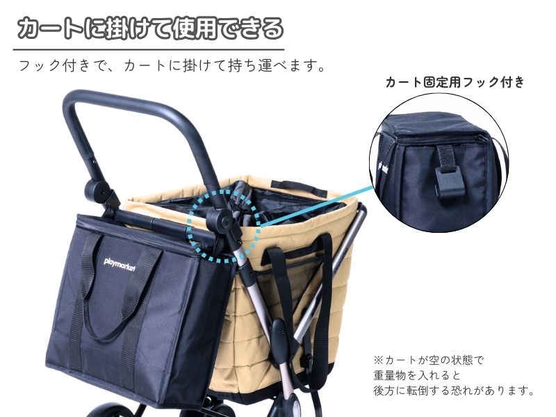 本体にはカート固定用フックを装備。会計後にクーラーバッグをウィゴー プレミアムに引っかければ、両手がフリーのまま店内から店舗出口、駐車場までスムーズに移動できます。バッグに詰め替えた後の動線を損なわず、荷物の取り回しがぐっと楽になります。